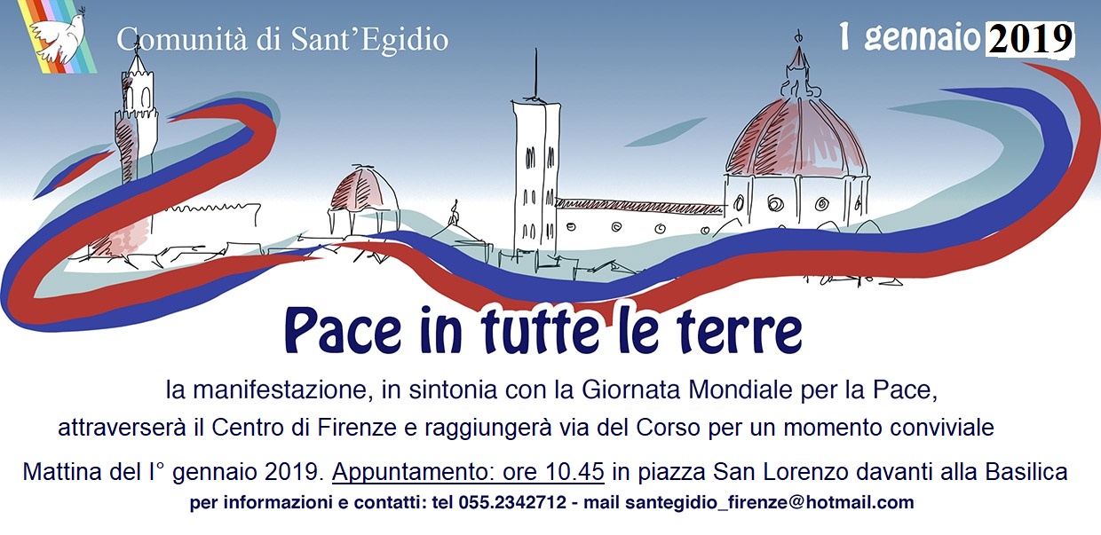 A Firenze, il I gennaio 2019, Giornata mondiale della pace, la Comunità di Sant'Egidio promuove la manifestazione 'Pace in tutte le terre'. L'appuntamento è alle ore 10.45 in Piazza San Lorenzo, di fronte alla Basilica, da dove, poi, il corteo prenderà le mosse per attraversare il Centro storico, risalendo verso Piazza della Repubblica e Piazza del Mercato nuovo, quindi Piazza Signoria e via dei Calzaiuoli, quindi via del Corso e la chiesa di Santa Maria dei Ricci, dove, a mezzogiorno, si potrà ascoltare l'Angelus e poi, presso i locali, brindare all'anno nuovo insieme. Il messaggio di Papa Francesco per la Giornata mondiale della pace è intitolato 'La buona politica è al servizio della pace'.