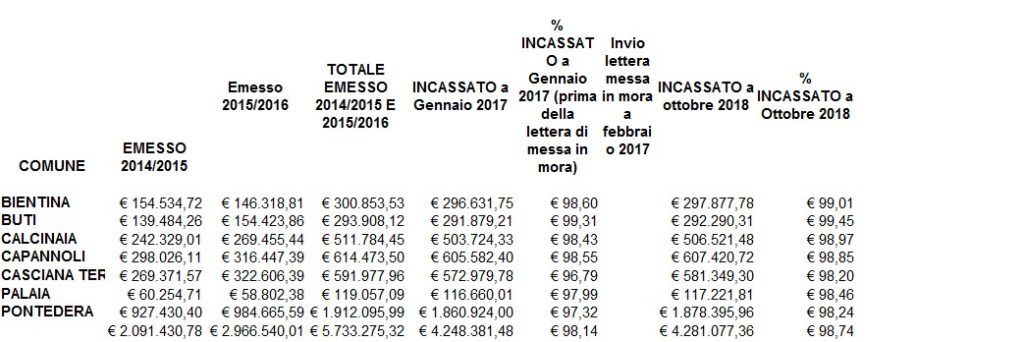 Tanto per fare un esempio concreto la percentuale di recupero per la morosità di un Comune come Calcinaia è passata dal 20% a quasi il 99% del 2017 (tabella 2).