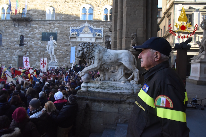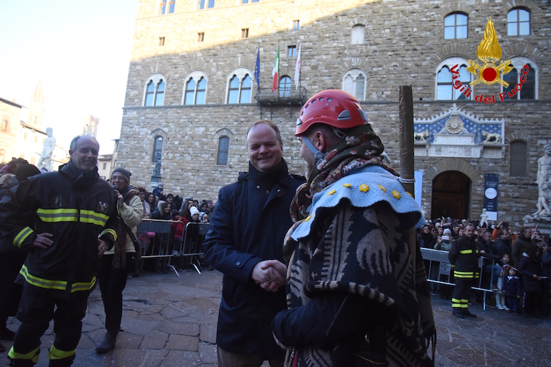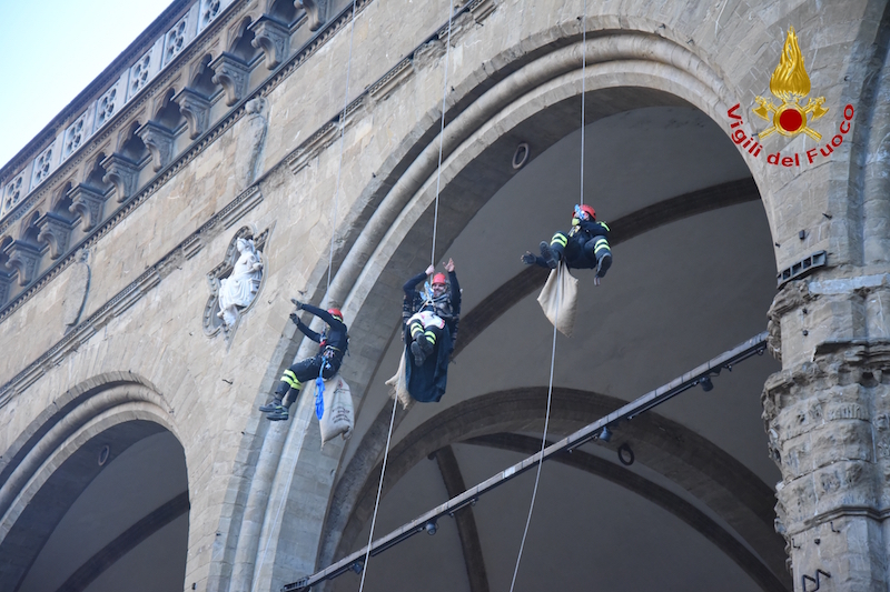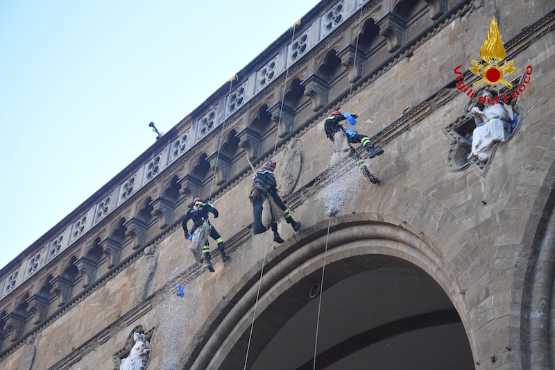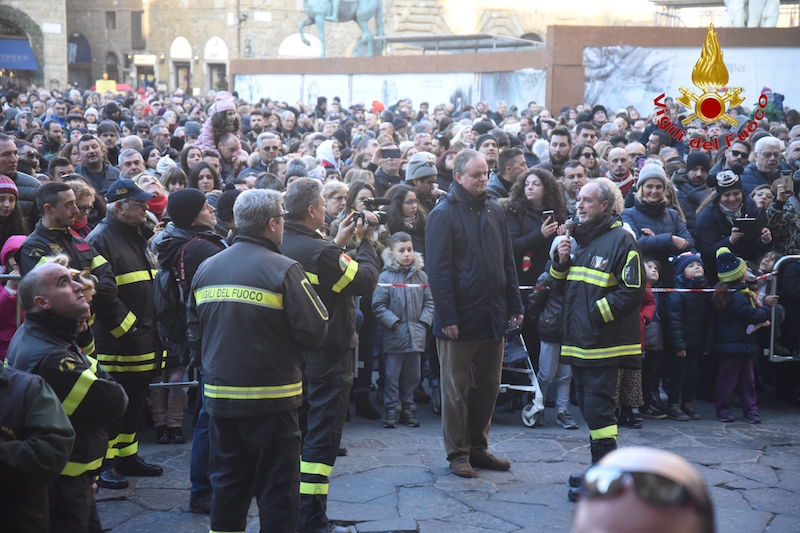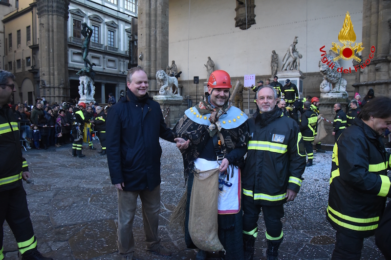 Nel pomeriggio del 6 gennaio intorno alle ore 15.30 un numero importante di persone si è raggruppato davanti alla Loggia dei Lanzi in Pizza della signoria, per veder scendere a Befana della Loggia dei Lanzi. L’evento organizzato dalla Galleria degli Uffizi ed i Vigili del Fuoco di Firenze con il Patrocinio del Comune, è giunto alla sua terza edizione e vede accrescere ogni anno il numero di curiosi che attirati da questo momento magico, si soffermano a guardare la calata della anziana signora, che con l’aiuto di 5 Vigili del Fuoco assicura l’importante sacco a terra. Ogni anno qualche piccola novità in questa edizione ha visto la calata di tre pompieri che hanno cosparso l’aria antistante la Loggia di coriandoli, così hanno predisposto una discesa sicura per la Befana degli Uffizi, l’anziana ed energica signora è così scesa affiancata da due Vigili del Fuoco, una volta giunti a terra i bambini si sono recati incuriositi presso la signora che ha donato caramelle. Quella degli Uffizi è soprattutto una Befana di solidarietà, che oltre ad allietare le famiglie accorse in centro per trascorrere un pomeriggio di festa, vuole restituire una speranza di rinascita alle collettività del Centro Italia colpite dal terremoto, raccogliendo un contributi che saranno destinati al restauro di un’oggetto identitario danneggiato. Anche per questo anno la festa della befana nel territorio fiorentino è stata realizzata grazie al sostegno della ditta dolciaria fiorentina Fallani Caramelle, con sede al Terrafino di Empoli; Caffetteria Bartolini situata sopra la Loggia dei Lanzi(Galleria degli Uffizi), dall’Associazione Nazionale vigili del Fuoco Sez. Firenze, Reparto Volo Vigili del Fuoco di Arezzo ed il Personale del Comando di Firenze oltre al Personale della Galleria degli Uffizi e del Comune di Firenze.