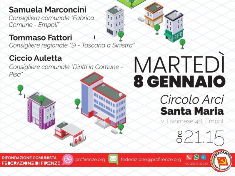 Il partito della Rifondazione Comunista organizza per martedì 8 gennaio un incontro dal titolo “Le città che vogliamo”, che si terrà alla Casa del Popolo di Santa Maria, a Empoli. Parteciperanno Amalia Chiovaro (consigliera comunale di “Sinistra in Comune per Vinci”), Samuela Marconcini (consigliera comunale di “Fabrica Comune - Empoli”), Mauro Mucciarelli (assessore del Comune di Montespertoli), Ciccio Auletta (consigliere comunale “Diritti in Comune - Pisa”) e Tommaso Fattori (consigliere regionale “Sì - Toscana a Sinistra”).