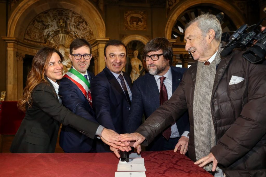Alla cerimonia Dario Nardella, Sindaco di Firenze; Antonella Mansi, Presidente Centro di Firenze per la Moda Italiana, Claudio Marenzi Presidente Pitti Immagine e Presidente e Confindustria Moda e con la partecipazione di: Vincenzo Boccia Presidente Confindustria, Carlo Maria Ferro Presidente Agenzia ICE, Michele Geraci Sottosegretario allo sviluppo economico, Marino Vago Presidente SMI.