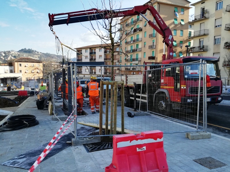 Sono arrivate e già in parte installate le nuove pensiline per la sosta degli autobus in piazza Mazzini. Proseguono i lavori di riqualificazione della piazza dove l’installazione delle pensiline e la sistemazione di tutta l’area, che si completeranno nei prossimi giorni, consentirà di procedere con il ripristino della normale circolazione dei mezzi di trasporto pubblico a cura di Tiemme Spa. In questi mesi infatti gli autobus hanno sostato fuori dalla piazza. A partire da giugno, per l’avanzare del cantiere, il terminal bus si è spostato parzialmente su via Trento mentre da settembre anche il trasporto scolastico si è temporaneamente spostato facendo sosta su via Montenero.