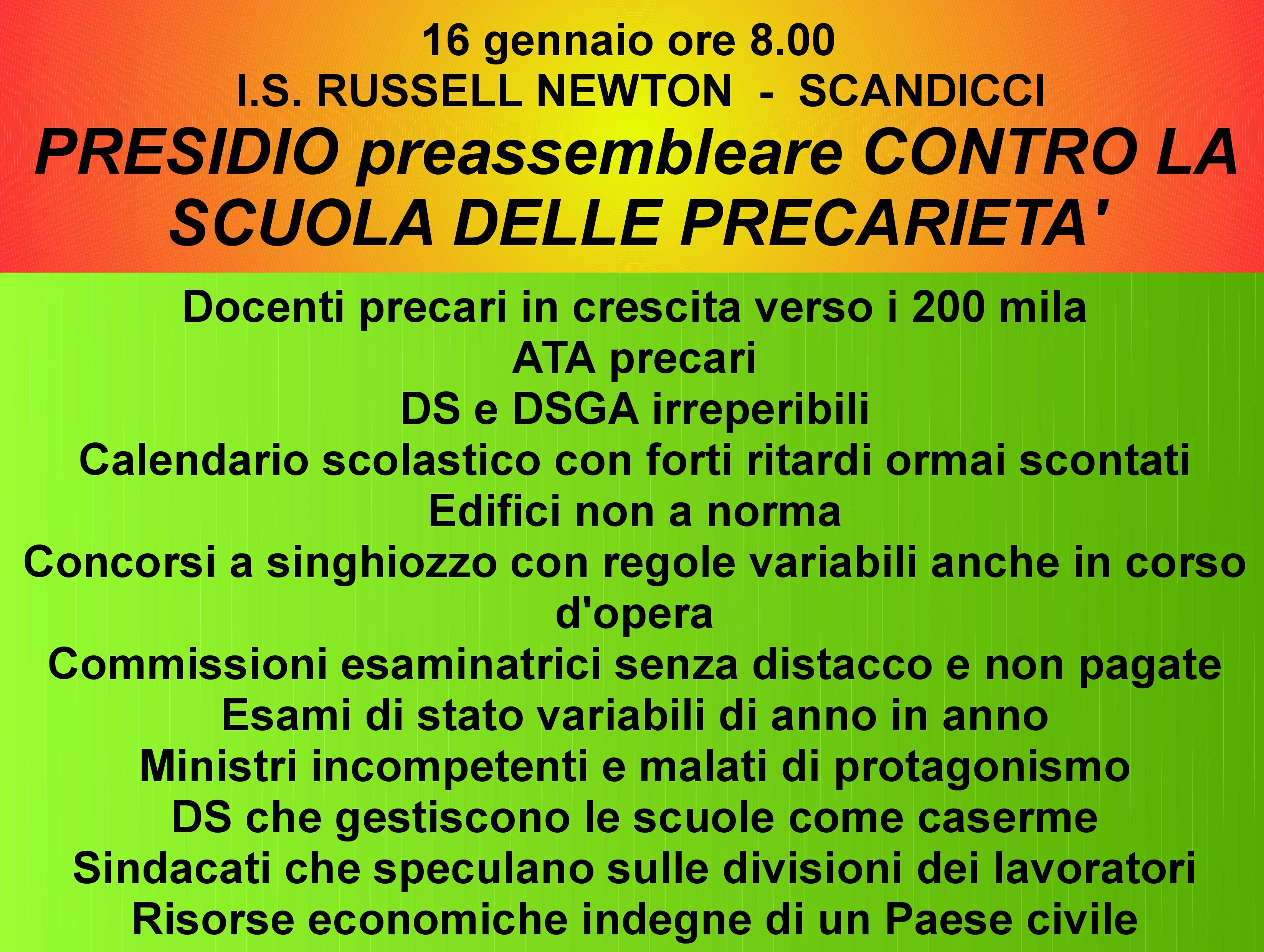 Per quanto risulta dalle informazioni che ci sono pervenute dalle varie realtà territoriali - sia della provincia di Firenze, sia di altre province - l'Assemblea Regionale del 16 gennaio si preannuncia particolarmente affollata; nonostante che a indirla sia un sindacato tradizionalmente poco attivo e poco amato dai docenti precari, il fermento sociale in atto è tale che approfitta della prima occasione offerta da un sindacato rappresentativo per convogliarsi e manifestarsi vistosamente all'opinione pubblica.