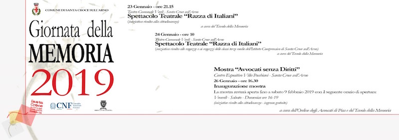 Per ricordare la Giornata della Memoria 2019, l’Amministrazione Comunale di Santa Croce sull’Arno, su proposta del Tavolo della Memoria, organizza alcune iniziative rivolte ai giovani e a tutta la cittadinanza con lo scopo di non dimenticare quello che ha rappresentato l’Olocausto negli anni più bui della storia recente dell’umanità.