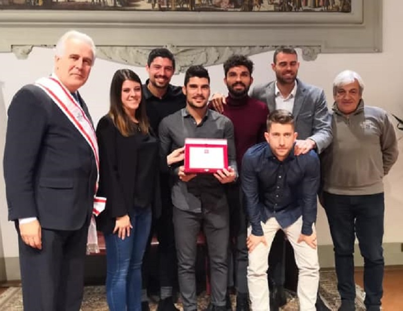 Una targa del Consiglio regionale della Toscana a cinque giocatori dell’A.S.D. Viareggio beach soccer per il risultato conseguito nel settembre del 2018 con la nazionale italiana che si è laureata campione d’Europa. Il riconoscimento è stato consegnato questa mattina, lunedì 21 gennaio, nella sala del Gonfalone del palazzo del Pegaso dal presidente dell’Assemblea toscana, Eugenio Giani, e dalla consigliera regionale Elisa Montemagni, capogruppo della Lega. “Ai cinque cavalieri della spiaggia della Versilia che hanno conquistato con la nazionale italiana il campionato europeo di beach soccer 2018”, queste la parole incise nella targa donata a Andrea Carpita, Gabriele Gori, Michele Di Palma, Simone Marinai e Dario Ramacciotti, che erano accompagnati dal presidente dell’A.S.D. Viareggio Beach Soccer, Giancarlo Carpita. Si tratta di atleti formati nella società viareggina.