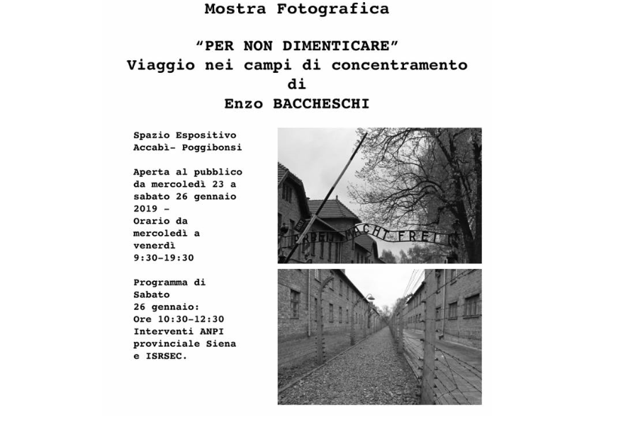 Arriva all’Accabì la mostra fotografica “Per non dimenticare”, un viaggio nei campi di concentramento a cura del fotografo Enzo Baccheschi. La mostra, promossa dall'Anpi di Poggibonsi con il patrocinio dell'Amministrazione, si svolgerà presso lo spazio espositivo dell'Accabì e sarà destinata agli alunni delle scuole primarie e delle scuole secondarie di primo e secondo grado.