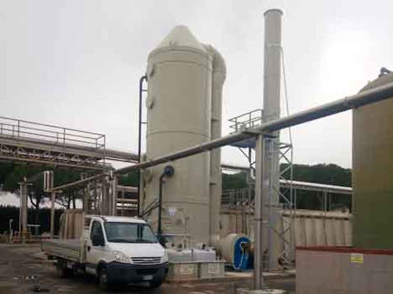 • nuovo impianto di messa sotto aspirazione delle apparecchiature contenenti sostanze odorigene ed abbattimento emissioni (camino E2) composto da Termox degli sfiati (da sezioni distillazione, evaporazione-concentrazione acque solventate, ecc.), munito di Sistema di Monitoraggio in Continuo delle Emissioni (SMCE) per parametro Carbonio Organico Totale (TOC), Reattore a secco con calce-carbone attivo, Filtro a maniche, Scrubber umido a doppio stadio (acido, alcalino/ossidante), Filtro a carbone attivo (guardia)