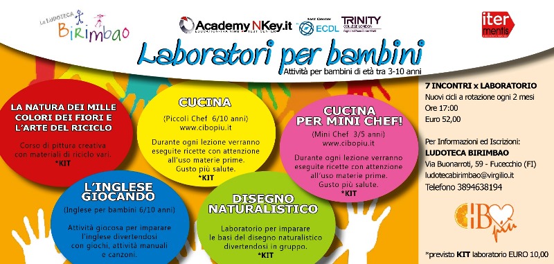 Nuovi corsi e laboratori per bambini ! in collaborazione con Ludoteca Birimbao, CiboPiu' e Nkey: lingua inglese, cucina (piccoli chef) , disegno naturalistico (imparare a disegnare piante e animali) - rilassamento/creatività e pittura (anche con materiale 'da riciclo'!) Il tutto con i nostri esperti insegnanti che daranno vita ad attività formative e coinvolgenti! Contattare la segreteria per tutte le informazioni!