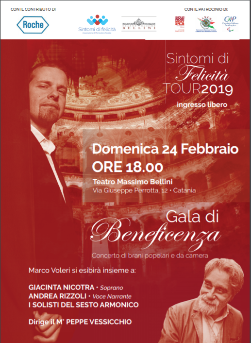 Due tappe, la prima il 24 febbraio al Teatro Bellini di Catania e la seconda il 17 aprile all’Auditorium CTO Careggi di Firenze. Sono questi i due eventi che caratterizzeranno il “Sintomi di Felicità Tour 2019”. In questa speciale edizione, il tenore Marco Voleri, sarà accompagnato dai Solisti del Sesto armonico diretti dal Maestro Peppe Vessicchio. Con loro anche il soprano Giacinta Nicotra, mentre la voce narrante è affidata all’attore Andrea Rizzoli.