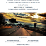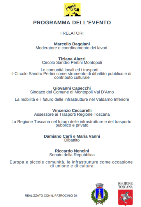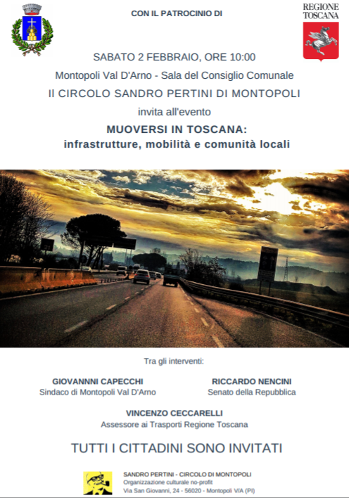 Muoversi in Toscana: infrastrutture, mobilità e comunità locali. Sabato 02 febbraio 2019 l'evento organizzato dal Circolo Sandro Pertini  presso la Sala Consiliare del Comune di Montopoli Val d'Arno. La manifestazione si colloca negli eventi politico-culturali aperti che dal 2019 verranno organizzati dal Circolo stesso.