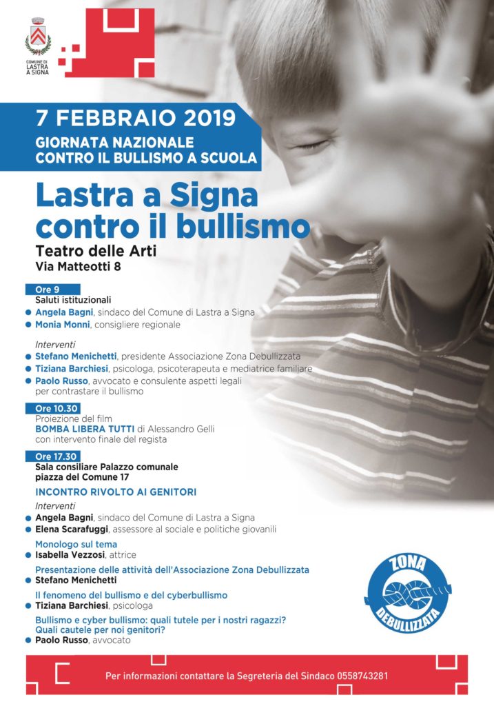 Si intitola “Lastra a Signa contro il bullismo” ed è l’iniziativa promossa dal Comune di Lastra a Signa in collaborazione con l’associazione Zona Debullizzata che si terrà il prossimo 7 febbraio in occasione della Giornata nazionale contro il bullismo a scuola, al Teatro delle Arti e in sala consiliare.