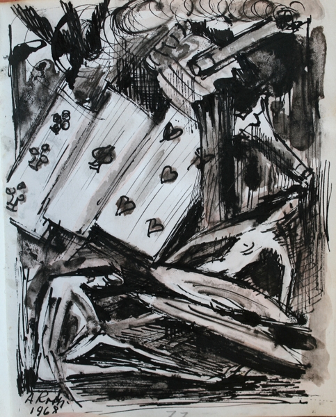 Mi piace condividere questa illustrazione che fece per un mio libretto di poesie dedicate a Bruna; qui si vedono i vizzi che attanagliano l’uomo: vino, tabacco, Venere, gioco con in fondo ‘uomo ridotto in cenere; Amleto amava filosofeggiare sulle cose della vita.