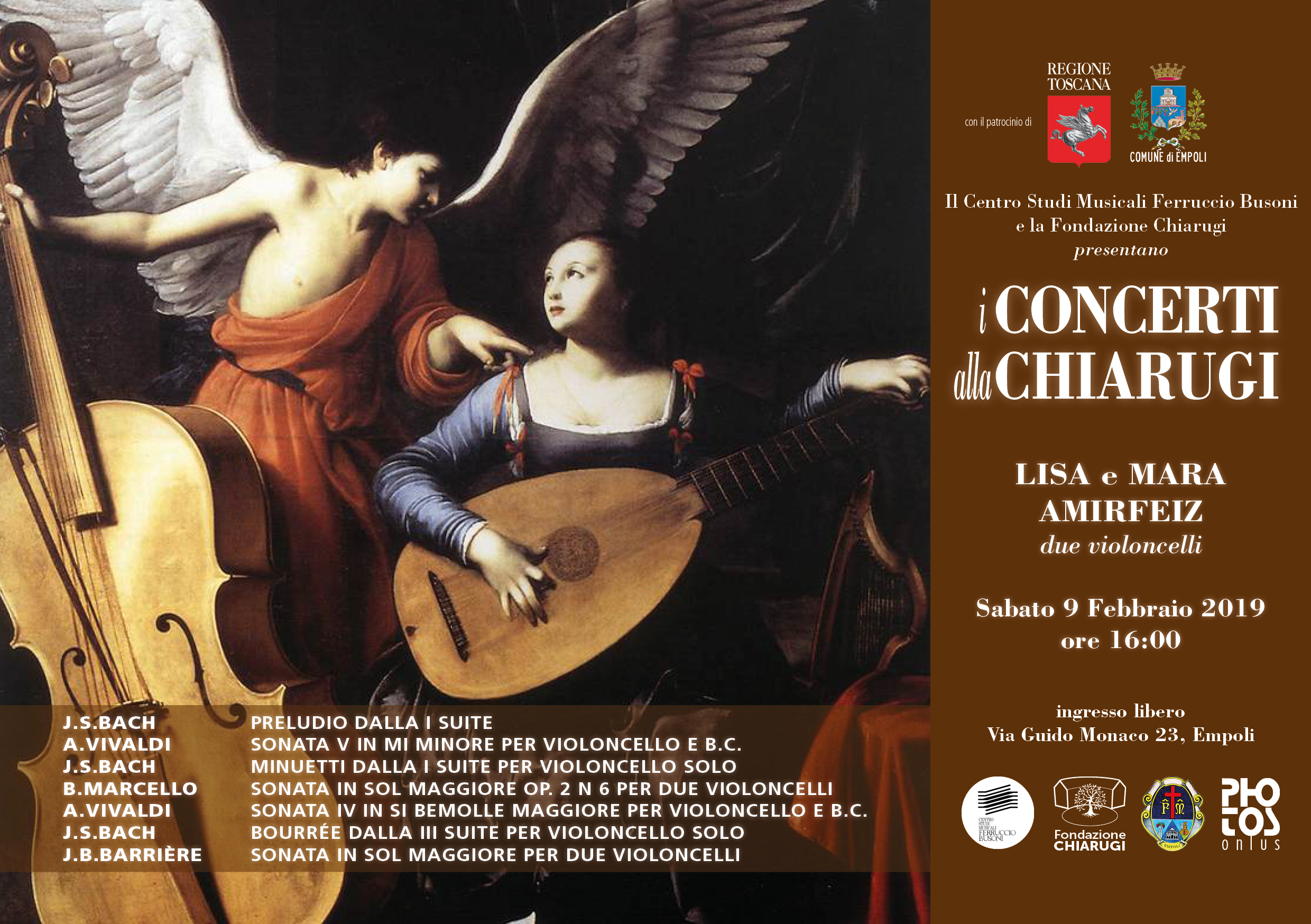 Sabato 9 febbraio alle ore 16.00, nel salone della Rsa Chiarugi (Via Guido Monaco 23, Empoli), Lisa e Mara Amirfeiz eseguiranno al violoncello brani di Bach, Vivaldi, Marcello e Barrière.