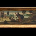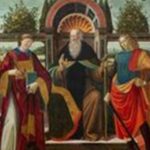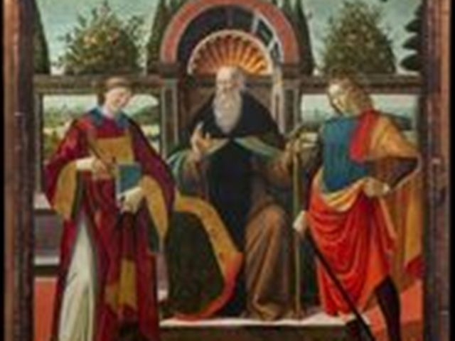 E’ qui raffigurato sant’Antonio Abate in trono tra San Leonardo, nelle sembianze di un giovane diacono che regge le tenaglie che liberavano dalle manette i carcerati e San Giuliano ospitaliere, in veste di cavaliere con la spada. Storie dei tre santi si leggono nella predella con Sant’Antonio scappa dalla tentazione del monte d’oro al centro, San Leonardo che libera i carcerati a sinistra e San Giuliano che uccide per sbaglio i genitori a destra. L’opera è da ricondursi nel catalogo del cosiddetto Maestro del Tondo Borghese, che prende il nome da un tondo con la Sacra Famiglia della Galleria Borghese di Roma. Varie ipotesi sono state avanzate per identificare l’ignoto pittore, ma nessuna risulta del tutto convincente. Attivo fra Quattro e Cinquecento, a Firenze e forse in Romagna - dove lascia opere a Bagno di Romagna - il pittore rivela una cifra stilistica che sembra indicare una frequentazione dell’ambito dei Ghirlandaio e dei Rosselli. Come frescante, fra il 1492 e il 1494, fu presente in Vaticano nel variegato cantiere degli Appartamenti Borgia che, sotto la guida del Pinturicchio, accolse numerosi artisti toscani. Lavorò in chiese e conventi di Firenze e della sua periferia, interprete di un filone essenzialmente devoto. La sua maniera è assai ripetitiva, quasi del tutto esente da scarti stilistici, che non rendono facile l’inquadramento cronologico delle sue opere. Nella tavola di San Lorenzo, tuttavia, i modi legnosi, incisi, asciutti del Maestro, acquistano una qualità inusitata, una morbidezza e un agio compositivo che evocano lo stile di Domenico Ghirlandaio e inducono a ipotizzare una collaborazione con quest’ultimo, alla cui bottega la pala era in passato attribuita. Tale collaborazione non presuppone necessariamente un’appartenenza del pittore alla bottega, tuttavia tangenze con l’atelier ghirlandaiesco sono frequenti nella sua intera attività.