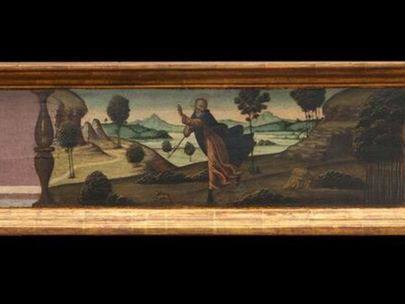 E’ qui raffigurato sant’Antonio Abate in trono tra San Leonardo, nelle sembianze di un giovane diacono che regge le tenaglie che liberavano dalle manette i carcerati e San Giuliano ospitaliere, in veste di cavaliere con la spada. Storie dei tre santi si leggono nella predella con Sant’Antonio scappa dalla tentazione del monte d’oro al centro, San Leonardo che libera i carcerati a sinistra e San Giuliano che uccide per sbaglio i genitori a destra. L’opera è da ricondursi nel catalogo del cosiddetto Maestro del Tondo Borghese, che prende il nome da un tondo con la Sacra Famiglia della Galleria Borghese di Roma. Varie ipotesi sono state avanzate per identificare l’ignoto pittore, ma nessuna risulta del tutto convincente. Attivo fra Quattro e Cinquecento, a Firenze e forse in Romagna - dove lascia opere a Bagno di Romagna - il pittore rivela una cifra stilistica che sembra indicare una frequentazione dell’ambito dei Ghirlandaio e dei Rosselli. Come frescante, fra il 1492 e il 1494, fu presente in Vaticano nel variegato cantiere degli Appartamenti Borgia che, sotto la guida del Pinturicchio, accolse numerosi artisti toscani. Lavorò in chiese e conventi di Firenze e della sua periferia, interprete di un filone essenzialmente devoto. La sua maniera è assai ripetitiva, quasi del tutto esente da scarti stilistici, che non rendono facile l’inquadramento cronologico delle sue opere. Nella tavola di San Lorenzo, tuttavia, i modi legnosi, incisi, asciutti del Maestro, acquistano una qualità inusitata, una morbidezza e un agio compositivo che evocano lo stile di Domenico Ghirlandaio e inducono a ipotizzare una collaborazione con quest’ultimo, alla cui bottega la pala era in passato attribuita. Tale collaborazione non presuppone necessariamente un’appartenenza del pittore alla bottega, tuttavia tangenze con l’atelier ghirlandaiesco sono frequenti nella sua intera attività.