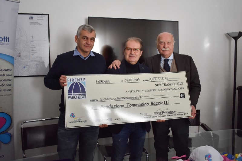 “La società Firenze Parcheggi ha da sempre avuto la massima attenzione verso i più deboli, siano essi rappresentati da minori o invalidi, ed in questo osservato principio di solidarietà rientra, tra le altre, questa iniziativa che parte nel 2015 e che vede la Società devolvere l’incasso del giorno di Natale di tutti i parcheggi a sostegno di progetti legati al mondo dell’infanzia – commentaCarlo Bevilacqua, Amministratore Delegato di Firenze Parcheggi. - Sono fermamente convinto che la civiltà di una nazione si misura con il peso delle azioni di solidarietà che ciascun singolo soggetto riesce a offrire. Oggi siamo felici di consegnare il nostro contributo alla Fondazione Tommasino Bacciotti, che da tempo sostiene con concreti risultati le famiglie che attraversano il dramma che consegue alle gravi malattie che hanno colpito i propri figli.”