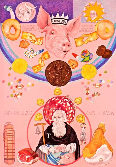 Da note filastrocche, sagaci affreschi di una “toscanità” noir dalla spietatezza disarmante pensandole destinate ai bambini, Cassigoli trae un immaginario simbolico, un mondo pop, surreale e nostalgico dove immagini di cibi tradizionali, animali fantastici e stereotipi della tradizione favolistica strizzano l’occhio in un affresco alla Hieronymus Bosch, dove l’ironia e lo humor nero giocano con la tradizione. L’approccio al disegno è filtrato da uno studio filologico più vicino all’analisi letteraria, le illustrazioni raccontano in maniera sincretica una e mille favole, evocando stagioni, riti, frammenti di storie che oramai fanno parte dell’immaginario collettivo di tutti noi. Il cibo, così come è sempre stato nelle favole, emerge fra i protagonisti principali di queste tavole. Un cibo che per secoli è mancato, è stato sognato, cercato, evocato in tutte le storie che compongono il nostro passato ancestrale.