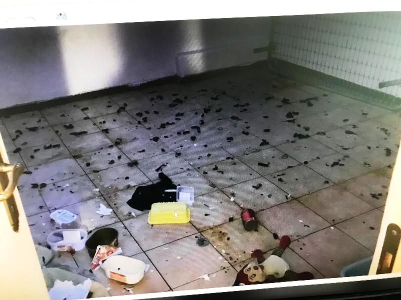 All'interno della stanza c'era un barboncino dal pelo bianco tremante, smunto e maleodorante. La stanza invece al suo interno era piena di escrementi, con finestra e persiane chiuse e senza ciotole o giacigli per l’animale.