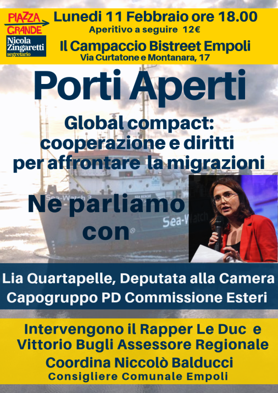 Un modo per capire a fondo i problemi e ripensare politiche più umane e coerenti in alternativa alle attuali assurde chiusure del governo nazionale che stanno creando, aldilà di facili proclami, soltanto maggiori tensione e minor possibilità di integrazione. L’iniziativa è promossa dal comitato “Piazza Grande Empolese-Valdelsa”, a sostegno del candidato Nicola Zingaretti alla segreteria del Partito Democratico.