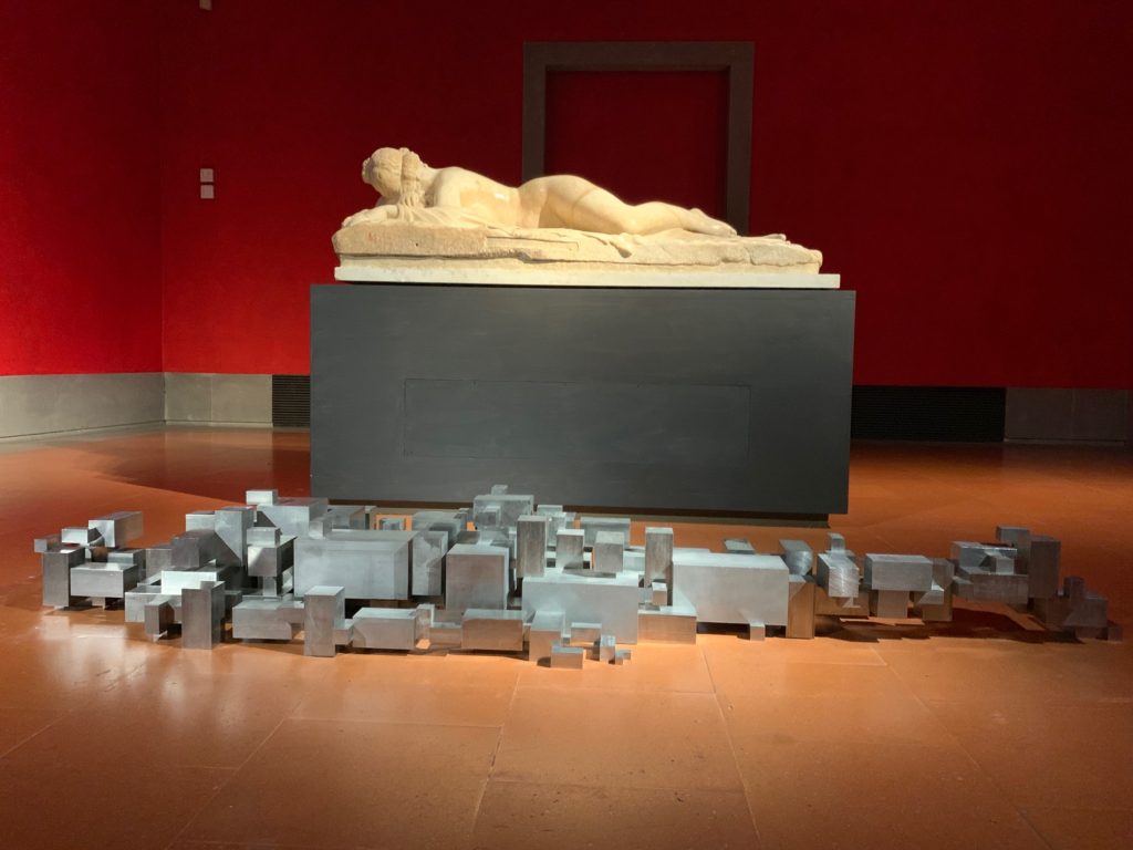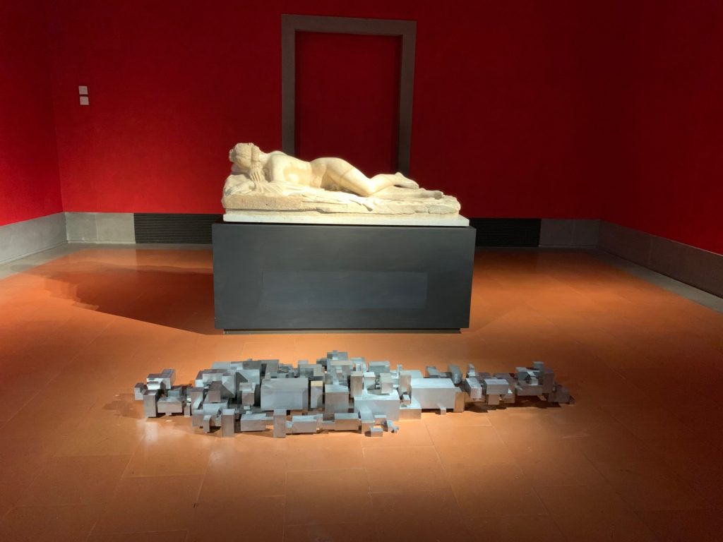 Le geometrie contemporanee di Antony Gormley mimetizzate tra le forme classiche delle sculture d'arte antica nella Galleria degli Uffizi di Firenze. Sono comparse con l'installazione, nottetempo, di due opere del celebre artista londinese al secondo piano del museo: Si tratta di 'Another time', collocata nel corridoio proprio di fronte alla grande vetrata che guarda Ponte Vecchio, e del blocco in forma umana 'Settlement', sul pavimento della sala 43, posto in dialogo con il celebre 'Ermafrodito dormiente', copia romana di età imperiale da un originale ellenistico del II secolo a.C, spostato qui per l'occasione dalla sua collocazione di fronte alla sala 38, sempre al secondo piano, dove si trova ordinariamente. Le installazioni (che saranno a breve seguite dall'arrivo, sulla terrazza sovrastante la Loggia dei Lanzi di un'altra versione di 'Another Time', costituiscono l' 'anticipo' di 'Essere', esposizione dedicata a Gormley ed accolta agli Uffizi dal 26 febbraio al 26 maggio. Ad esserne protagoniste saranno numerose opere dell'artista inglese, realizzate in diversi materiali e dimensioni, che esplorano la doppia tematica del corpo nello spazio e del corpo come spazio.