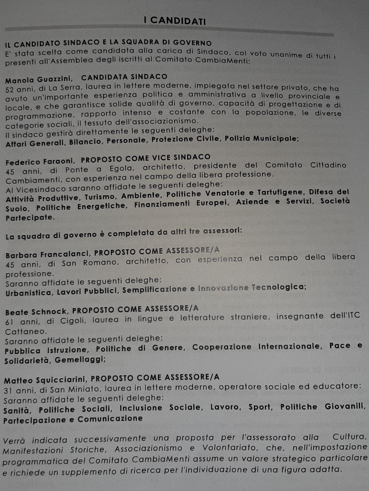 CambiaMenti fa le cose in grande e presenta il suo candidato sindaco, Manola Guazzini, assieme alla possibile giunta in caso di vittoria alle amministrative di San Miniato. Guazzini figurava tra una rosa di nomi dei vari membri più attivi del comitato nato meno di un anno fa, tra cui figuravano l'architetto Federico Faraoni e il giovane impegnato nel volontariato locale Matteo Squicciarini.