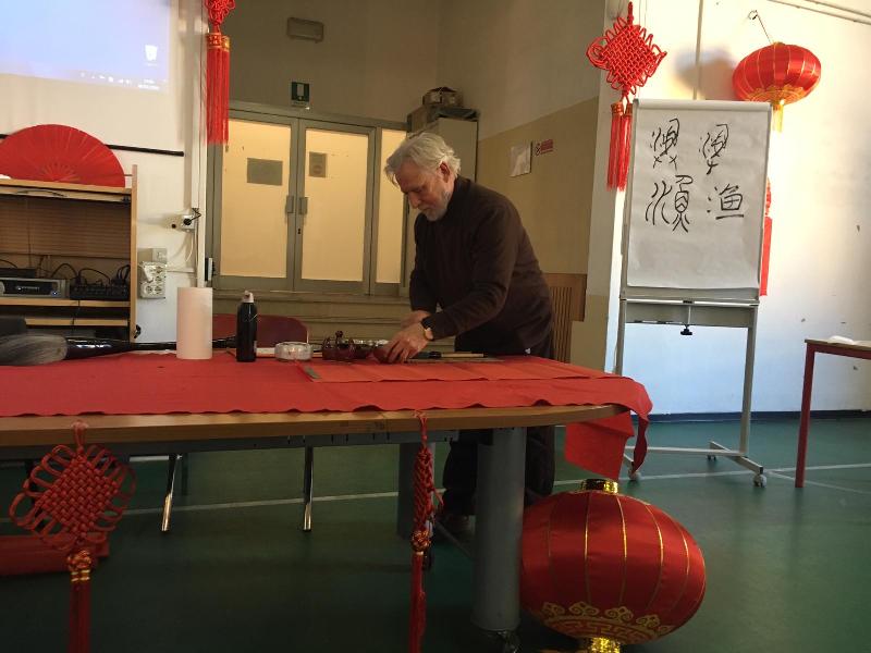 Nell’occasione, il Prof. Piccioli, dell’Associazione Feimo di Firenze ha mostrato e spiegato l’importanza delle origini dei caratteri cinesi e il processo di semplificazione degli stessi, scegliendo degli esempi legati a cibo e bevande, e confrontando gli stili di scrittura dai tempi dell’antica Cina fino ai giorni nostri.