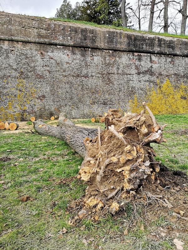 “Il tiglio caduto questa notte dal baluardo la Libertà sugli spalti sottostanti non ha provocato danni al parapetto delle mura – dichiara l'assessore ai lavori pubblici Celestino Marchini - L'evento non era prevedibile in quanto la pianta non mostrava segni evidenti di malattia. Tutta la zona è infatti controllata annualmente con particolare attenzione da tecnici agronomi specializzati perché compresa nel circuito di Murabilia – mostra mercato del giardinaggio di qualità. Negli anni per evitare qualsiasi rischio l'Opera delle Mura ha provveduto a compiere abbattimenti selettivi di alberi che potevano avere problemi di stabilità proprio su quel baluardo. Come già detto l'albero in questione, come si può vedere anche delle sezioni in cui è stato diviso, era perfettamente sano nella parte sopra il suolo. La caduta è stata dovuta al cedimento delle radici sottoposte al carico del forte vento di ieri notte. Queste, come si può vedere nelle immagini, erano molto indebolite perché attaccate in modo profondo da un fungo. Purtroppo nonostante le tecniche avanzate che gli agronomi hanno a disposizione, se non vi sono segnali chiari sull'aspetto esteriore e sulla vitalità della pianta, non è possibile conoscere esattamente lo stato di salute delle radici nel sottosuolo”.
