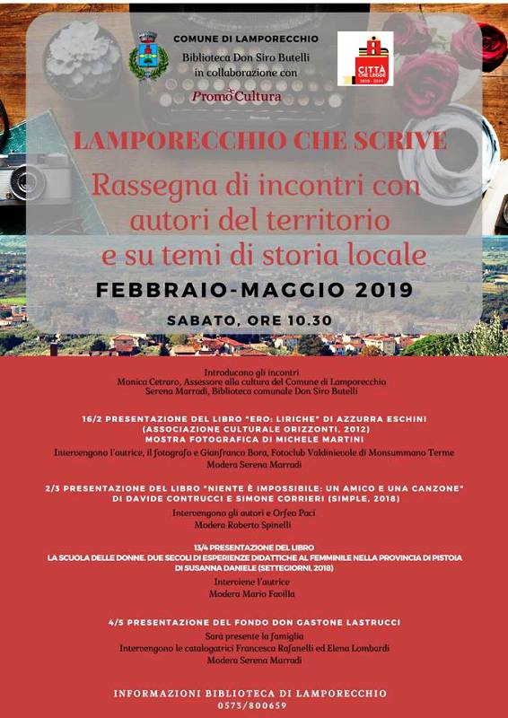 Inizia sabato 16 febbraio “Lamporecchio che scrive”, la nuova rassegna curata dalla biblioteca comunale Don Siro Butelli di Lamporecchio che da febbraio a maggio ospiterà 4 incontri dedicati ad autori del territorio e a temi di storia locale.