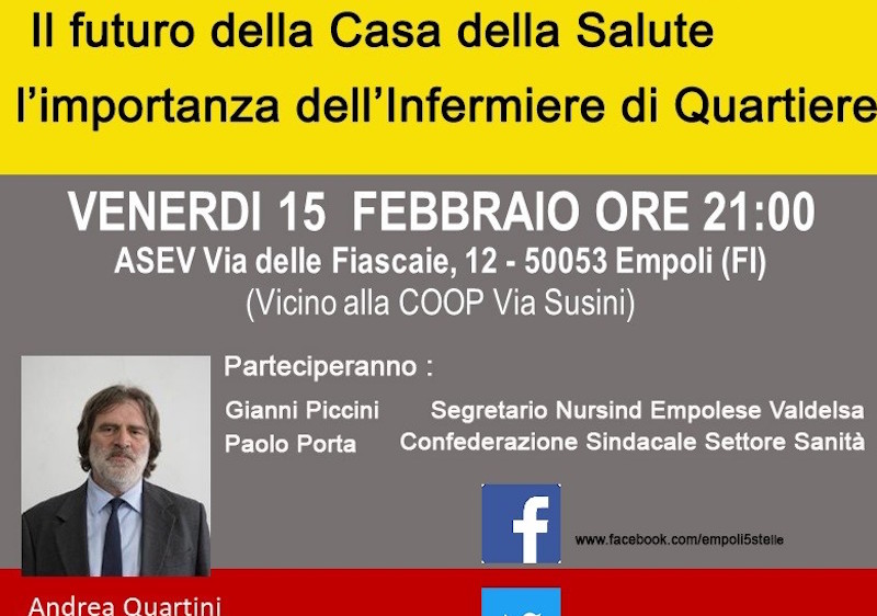 A Empoli si terrà una serata di approfondimento sul tema "Casa della Salute". L'evento si svolgerà Venerdì sera 15 Febbraio alle 21 presso la sala conferenze ASEV in via delle Fiascaie, 12. Sono invitati anche rappresentanti Sindacali di organizzazioni Sanitarie e Il Consigliere Regionale Dr. Andrea Quartini.