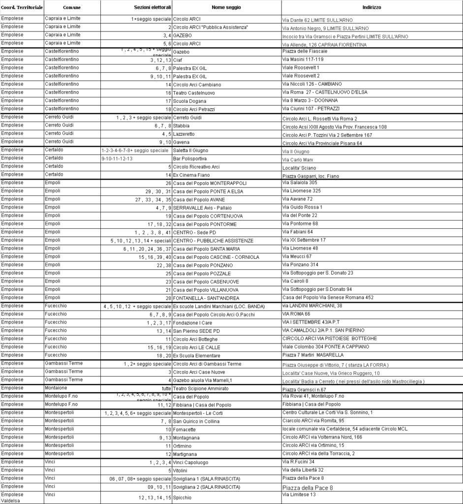 | Empolese Valdelsa | Montespertoli | 1, 2, 3, 4, 5, 6+ seggio speciale | Montespertoli - Le Corti | Centro Culturale Le Corti Via S. Sonnino, 1 |
