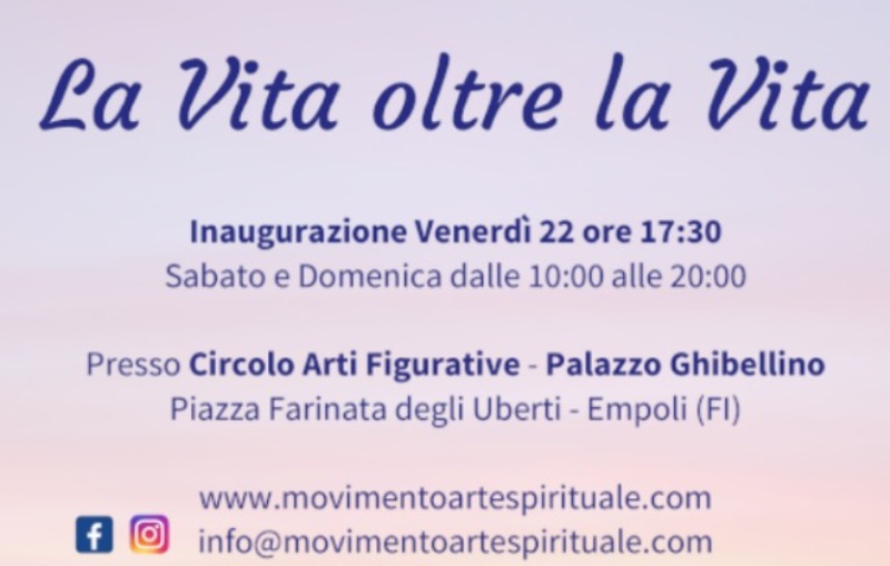 La mostra collettiva “La Vita oltre la Vita” si svolgerà a Empoli presso Circolo Arti Figurative a Palazzo Ghibellino, Piazza Farinata degli Uberti, Empoli (FI). L’evento è gratuito e l’inaugurazione sarà venerdì 22 Febbraio alle 17:30. Sabato 23 a domenica 24, l’orario di apertura sarà dalle 10:00 alle 20:00.