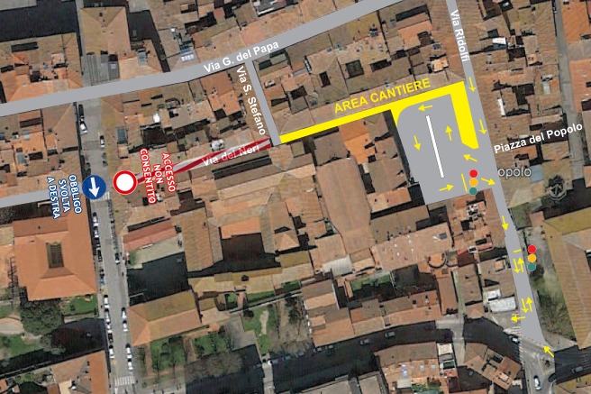 CAMBIA VIABILITÀ - Lavorando su questo tratto sarà impossibile accedere a Piazza del Popolo arrivando da Via dei Neri e per questo i tecnici dell’amministrazione comunale hanno pensato a una soluzione temporanea che modificherà la viabilità nell’area fra Piazza del Popolo e Via Ridolfi.