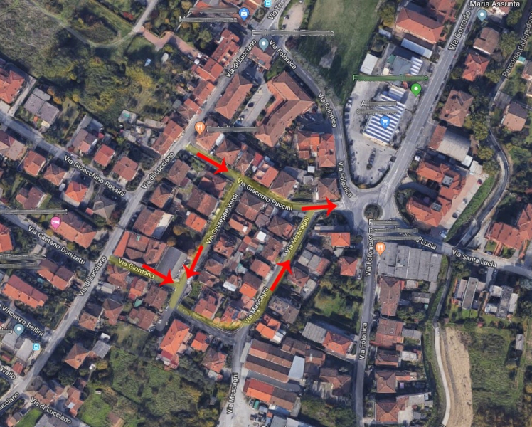 La zona è interessata prevalentemente da un traffico residenziale. Le misure hanno lo scopo di migliorare la viabilità interna e, attraverso l'istituzione di alcuni sensi unici, ricavare nuovi posti auto a servizio degli abitanti. In via Puccini sarà dunque istituito il senso unico di marcia con direzione consentita da via Lucciano verso via Folonica. In via Ugo Giordano sarà istituito un senso unico con direzione da via Lucciano verso via Giuseppe Verdi. In via Giuseppe Verdi sarà istituito un senso unico di marcia con direzione consentita da via Giacomo Puccini verso via Claudio Monteverdi. In via Pietro Mascagni sarà istituito un senso unico di marcia con direzione consentita da via Claudio Monteverdi verso via Giacomo Puccini.