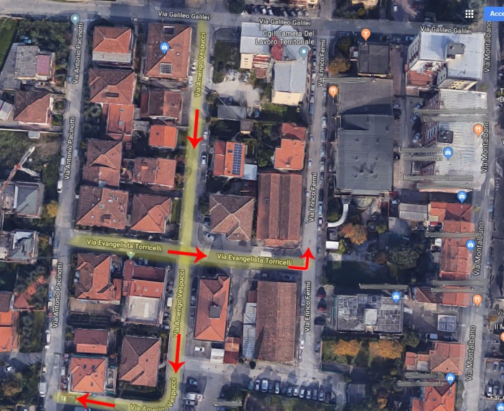 In questa zona le modifiche al transito hanno lo scopo di fluidificare la circolazione e ricavare alcuni nuovi posti auto per i residenti della zona. In via Vespucci, nel tratto compreso tra via G.Galilei e via A. Pacinotti, sarà abolito il doppio senso di circolazione e sarà istituito il senso unico di marcia con direzione consentita verso via A. Pacinotti; In via Evangelista Torricelli sarà abolito il doppio senso di circolazione sarà istituito il senso unico di marcia in direzione da via A. Pacinotti verso via E. Fermi.