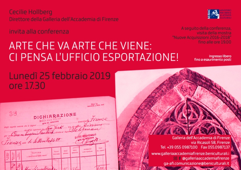 Il tema della conferenza è inoltre in linea con l’obiettivo della mostra allestita dal 22 gennaio e in corso fino al 5 maggio prossimo “Nuove Acquisizioni 2016-2018”, ovvero far comprendere al grande pubblico come un’istituzione pubblica di rilievo internazionale, appartenente alla rete nazionale dei musei MIBAC, come la Galleria dell’Accademia di Firenze, sia impegnata, non solo nell’attività di conservazione delle proprie collezioni, ma anche, al loro incremento tramite acquisizioni, donazioni, assegnazioni per confisca.