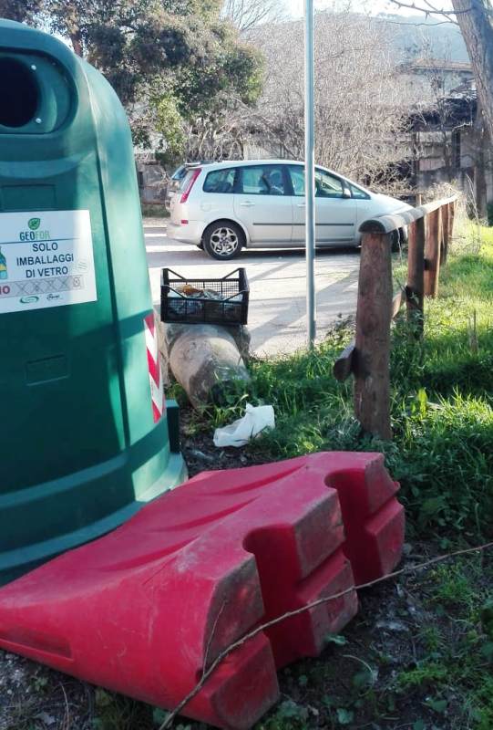 Ancora più stato di abbandono nell’area vicino alla locale stazione dei Carabinieri intitolata, pochi mesi fa, al medico condotto Goffredo De Angelis: new jersey, cassette di plastica, terminetto in cemento ed altri oggetti lasciati lì a pochi passi da dove parcheggia il Sindaco Ghimenti e i membri della sua Giunta.