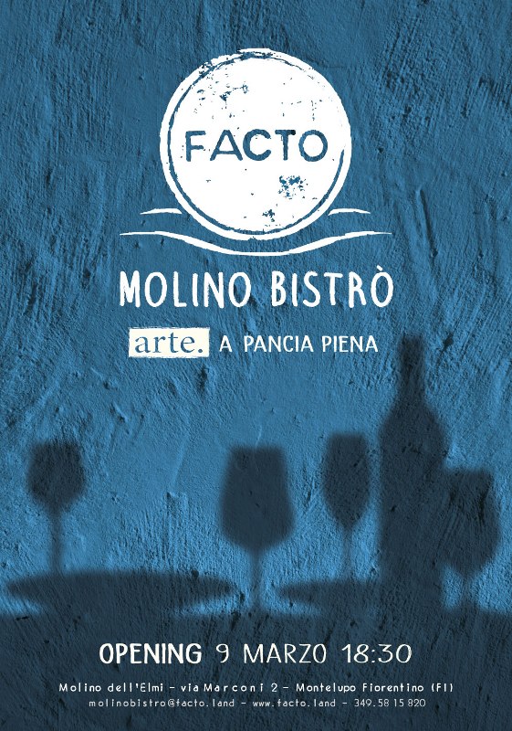 Infine il 9 marzo alle ore 18:30 inaugura il FACTO Molino Bistrò, presso l’antico Mulino dell’Elmi in via Marconi, con la collaborazione dello Chef Paolo Fiaschi del ristorante Papaveri e Papere di San Miniato. Al Bistrò si potrà fare una colazione tarda con caffetteria e torte fatte in casa, gustose e veloci pause pranzo, aperitivi e cene leggere e appetitose, con una formula che valorizza le filiere enogastronomiche a km 0 e propone piccoli spuntini da degustare in compagnia con del buon vino locale.