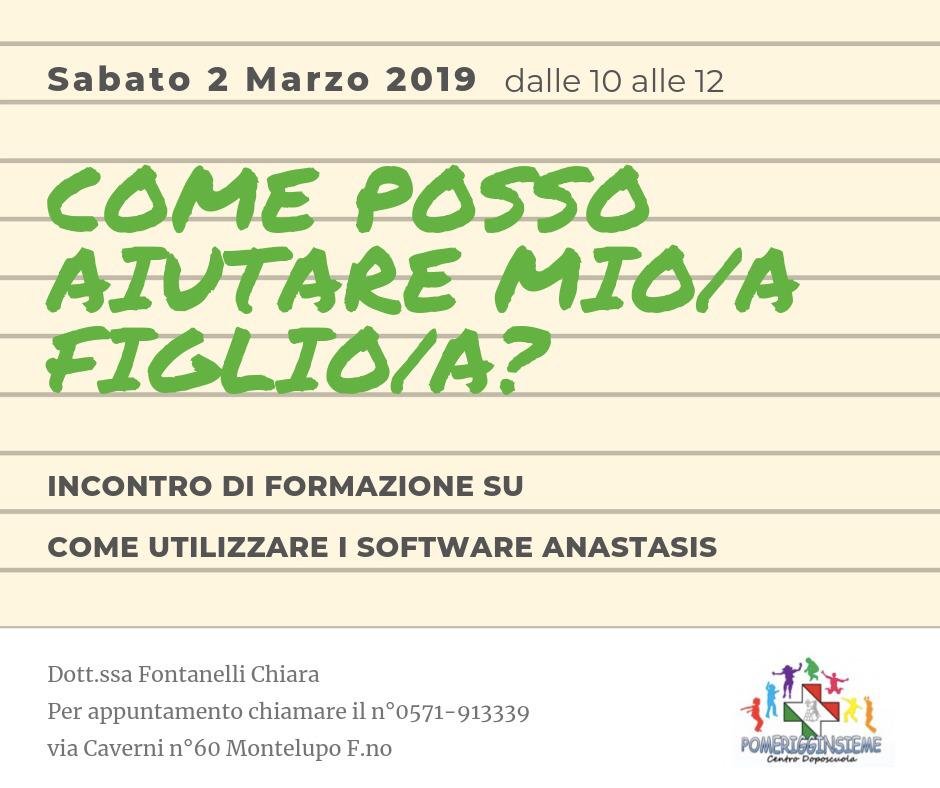 Sabato 2 marzo dalle 10 alle 12, negli spazi del doposcuola Pomerigginsieme, in via Caverni, 60, a Montelupo Fiorentino, si terrà un incontro gratuito di approfondimento su come si usano gli strumenti compensativi Anastasis. La dottoressa Chiara Fontanelli spiegherà a tutti i partecipanti quali sono e come si usano gli strumenti Anastasis e in che modo possono aiutare i ragazzi con Disturbi Specifici dell'Apprendimento ad esprimere tutto il loro potenziale.