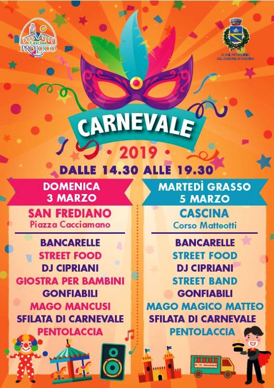 Domenica 3 e martedì 5 marzo doppio appuntamento con il Carnevale 2019 organizzato dalla Pro Loco di Cascina con il patrocinio del Comune.