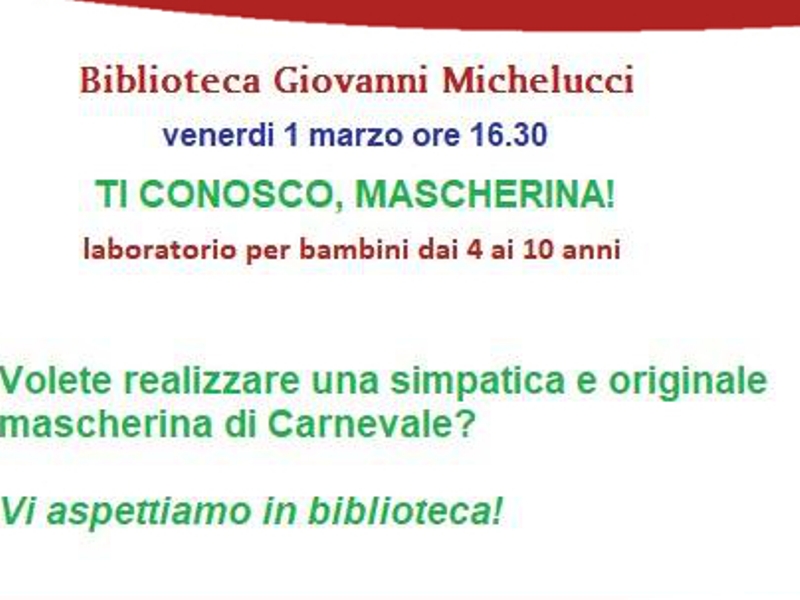 Venerdì 1 marzo alle ore 16.30 la biblioteca comunale Giovanni Michelucci di Quarrata organizza un laboratorio per bambini dedicato al Carnevale. "Ti conosco Mascherina" è il titolo dell'iniziativa, pensata per una fascia di età dai 4 ai 10 anni, durante la quale il personale della biblioteca realizzerà insieme ai piccoli partecipanti divertenti e colorate maschere di Carnevale.