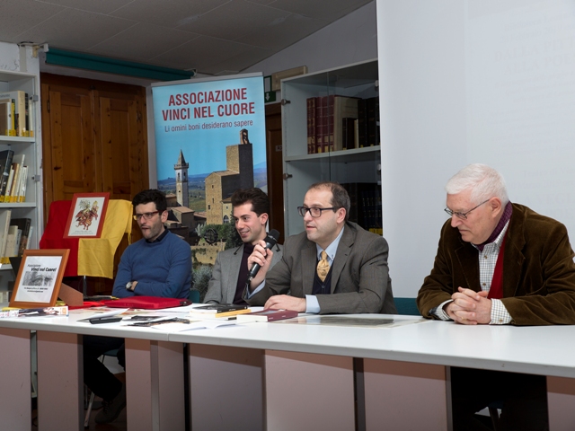 A illustrare la sua tesi, in una Biblioteca Leonardiana piena, il professor Marco Cipollini, saggista, poeta, redattore, nonché fra i fondatori di Erba d'Arno. Accanto a lui, durante la serata è intervenuto anche Samuele Lastrucci, direttore musicale del Da Vinci Baroque Festival, che con il suo supporto ha inaugurato la sua collaborazione con l'associazione Vinci nel Cuore come consulente per la parte musicale per tutta la durata della rassegna.