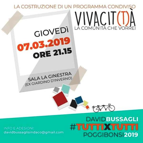 Giovedì 7 marzo tornano a riunirsi i tavoli tematici con cui ha preso il via “Vivacit(t)à, la comunità che vorrei”, il percorso partecipato per scrivere il programma di governo di Poggibonsi per i prossimi cinque anni. L’appuntamento è alle 21 presso la sala La Ginestra dove si è svolto il primo incontro. “Un incontro largamente partecipato e in cui i tanti intervenuti hanno prodotto una valanga di idee, spunti e aspettative sulla Poggibonsi del futuro – dice il candidato a Sindaco David Bussagli – Sui contributi raccolti è già stato fatto un importante lavoro di approfondimento e affinamento, grazie ai moderatori, e adesso c’è bisogno di tornare a confrontarsi su quanto prodotto per portare le idee ad un ulteriore livello di definizione”.