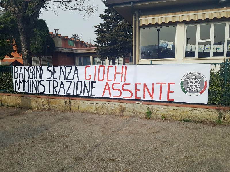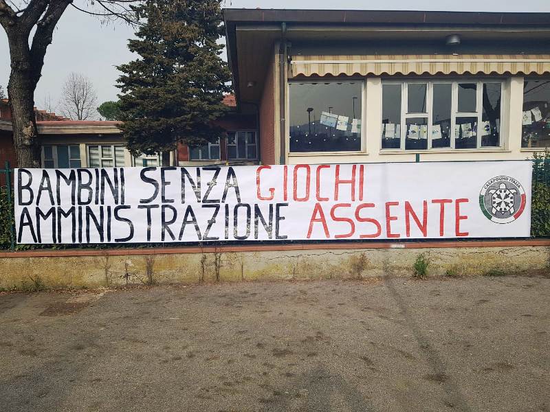 Questo pomeriggio, a seguito delle numerose segnalazioni da parte dei genitori, i militanti di CasaPound Scandicci hanno denunciato, con lo striscione “BAMBINI SENZA GIOCHI, AMMINISTRAZIONE ASSENTE", la situazione del giardino dell’asilo Turziani che da più di anno si trova senza giochi a causa dell'inerzia del Comune che non sta provvedendo a reinstallarli.