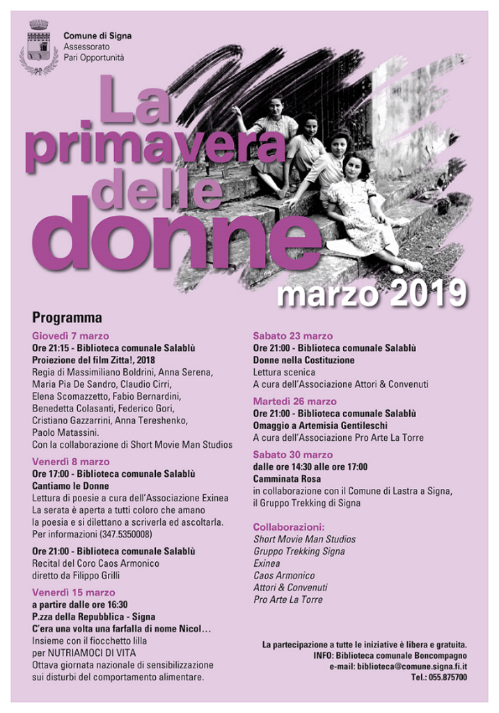 L’Assessorato alle Pari opportunità ripropone, come negli anni passati per tutto il mese di marzo, numerose iniziative rivolte alle donne e incentrate sulle problematiche femminili in occasione della Giornata Internazionale della Donna.