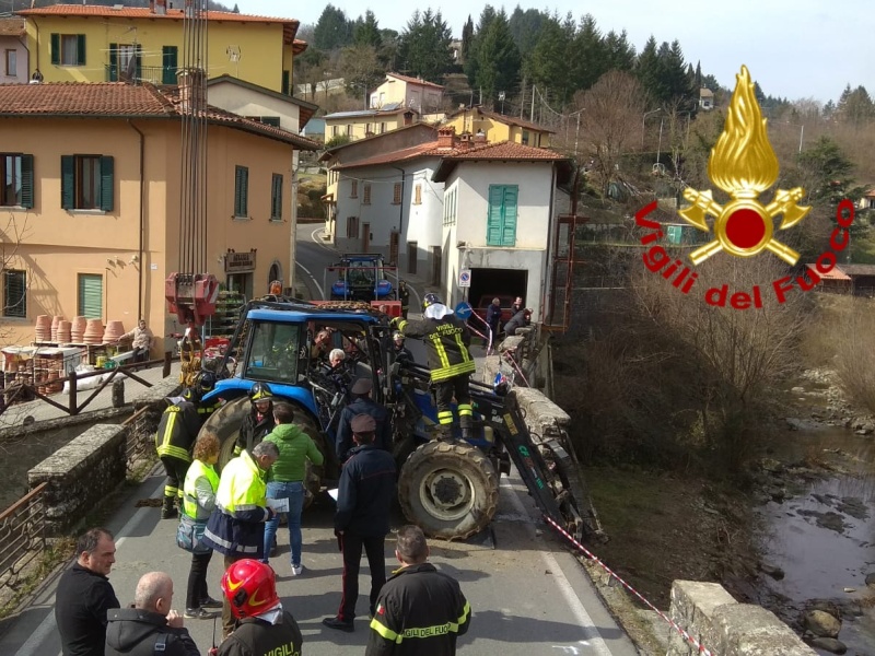 I vigili del fuoco di Arezzo, Bibbiena e Pratovecchio sono stati impegnati in una difficile situazione avvenuta a Stia, lungo la via Fiorentina, per un incidente stradale con un trattore con rimorchio caduto dal ponte che attraversa l'Arno.