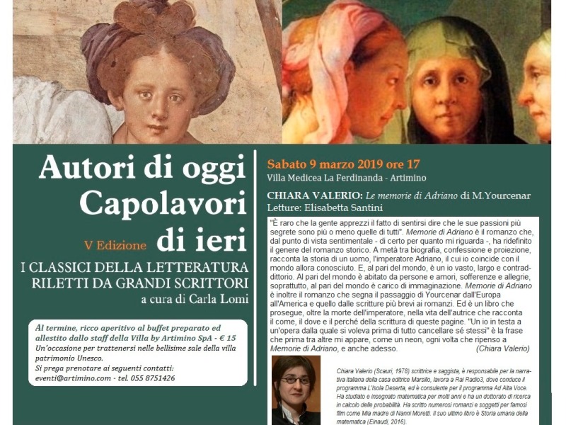Terzo appuntamento con la quinta edizione di “Autori di oggi, capolavori di ieri”, la rassegna dedicata ai classici della letteratura organizzata dai Comuni di Carmignano e Poggio a Caiano e curata da Carla Lomi. Sabato 9 marzo alle 17 nella splendida cornice della Villa Medicea La Ferdinanda di Artimino la scrittrice Chiara Valerio proporrà una rilettura di un grande capolavoro di ieri, “Memorie di Adriano” di Marguerite Yourcenar. Le letture saranno invece affidate all’attrice Elisabetta Santini.