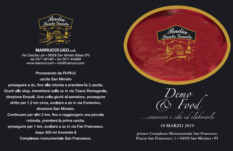 La ditta Marrucci Ugo Srl di San Miniato Basso organizza una giornata speciale, ovvero 'Demo & Food'. L'azienda è una delle più importanti nella zona nel settore della ristorazione e opera sul territorio da oltre 40 anni. Il 18 marzo ha organizzato, presso il complesso monumentale di San Francesco a San Miniato, un evento con circa 30 aziende che presenteranno, tramite i loro chef, le novità dei loro prodotti. Saranno presenti aziende da tutta Italia, ma anche spagnole e francesi. Degustazioni, dunque, ma anche un viaggio tra le nuove tendenze del cibo.