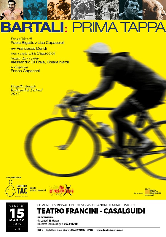 Dopo il successo di Lorenzo Baglioni con Bella, Prof!, il Teatro Francini ospita venerdì 15 marzo (ore 21) il secondo appuntamento per la stagione serale 2019, promossa da Comune di Serravalle Pistoiese e Associazione Teatrale Pistoiese: Bartali: prima tappa, uno spettacolo, in forma di monologo, che vuole, attraverso la figura di uno dei ciclisti italiani più significativi del nostro secolo, approfondire alcune tematiche storiche connesse agli anni dell’occupazione nazista e alle relative conseguenze.