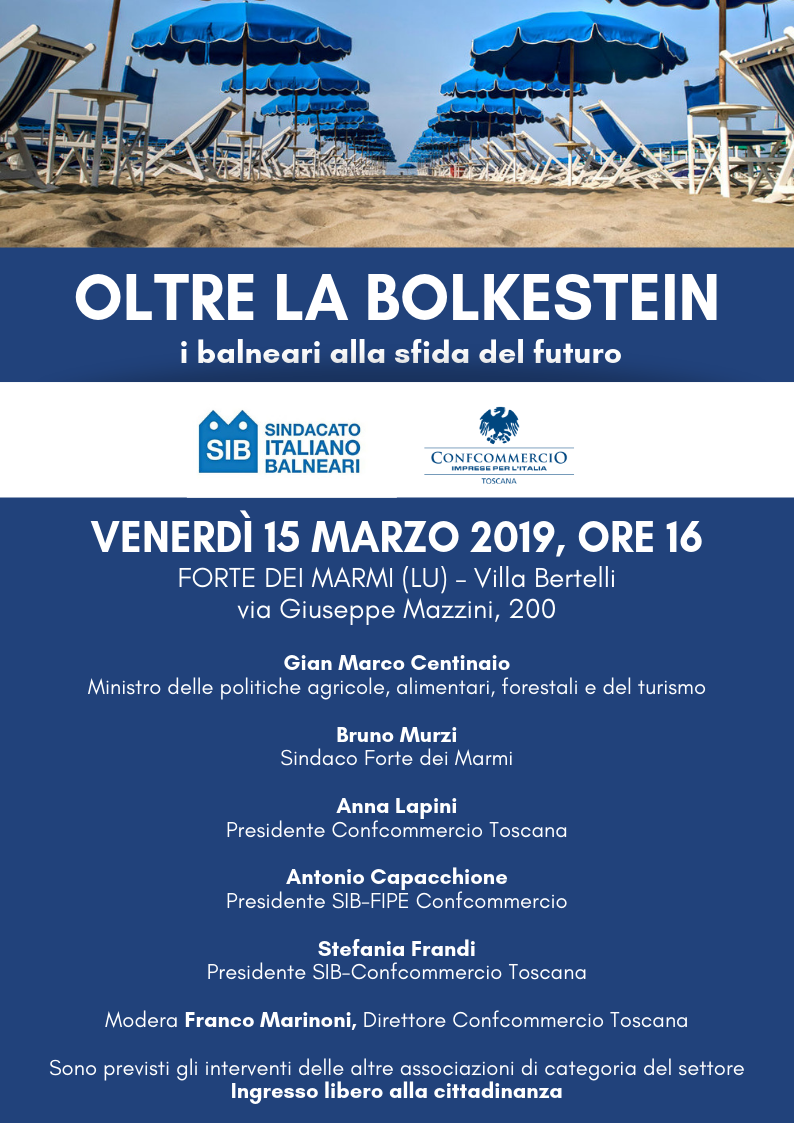 Venerdì 15 marzo il ministro delle politiche agricole, alimentari, forestali e del turismo Gian Marco Centinaio sarà a Forte dei Marmi ospite del convegno dei balneari toscani “Oltre la Bolkestein. I balneari alla sfida del futuro”, organizzato da SIB (Sindacato Italiano Balneari)-Confcommercio e Confcommercio Toscana per fare il punto sulla situazione del settore.