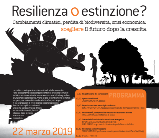 Il giorno 22 marzo 2019, presso la Sala Convegni del Polo Didattico delle Piagge (Università di Pisa) in via Matteotti 11, dalle ore 9,30 si terrà un importante convegno dal titolo “Resilienza o estinzione? Cambiamenti climatici, perdita di biodiversità, crisi economica: scegliere il futuro dopo la crescita” che vede Serge Latouche (economista e filosofo) tra gli illustri i relatori. Tema centrale del Convegno sono le radici profonde della ormai cronica crisi sociale ed economica. Saranno affrontati vari aspetti di questa complessa dinamica, ponendo in risalto il ruolo centrale che in essa gioca la distruzione della biosfera. Oramai l’uomo, con il suo bestiame, rappresenta il 95% dei mammiferi terrestri. Città, campi e piantagioni occupano circa il 50% delle terre emerse, i banchi di pesca stanno scomparendo sostituiti da banchi di plastica, le barriere coralline stanno morendo in un mare sempre più caldo ed acido, le stagioni diventano sempre più siccitose. Mai si parla di queste cose quando si pensa alla crisi sociale ed economica, eppure è la biosfera con la sua biodiversità che assicura condizioni climatiche favorevoli, acqua abbondante e di buona qualità, suoli fertili, qualità dell’aria e molto altro ancora. Il suo degrado provoca quindi condizioni di ineguale accesso alle risorse che stanno facendo crescere la povertà, i conflitti, i flussi migratori in tutto il mondo. Una situazione che sta interessando anche i paesi cosiddetti “sviluppati” dove, nella vana speranza di rilanciare una crescita che si scontra con i limiti fisici del Pianeta, si stanno vanificando perfino i provvedimenti presi in passato. Così anche in Toscana l’espansione delle cave sta distruggendo le Apuane, speculazioni di ogni genere assediano il Parco di Migliarino S.Rossore Massaciuccoli, gli incendi e l’industria del cippato minacciano i boschi della regione e la crisi colpisce principalmente le fasce più deboli della società. Il convegno del 22 marzo raccoglie personalità di alto profilo per discutere di questa situazione e per richiamare le autorità all’applicazione degli impegni che si sono assunti, ma che non sempre rispettano.